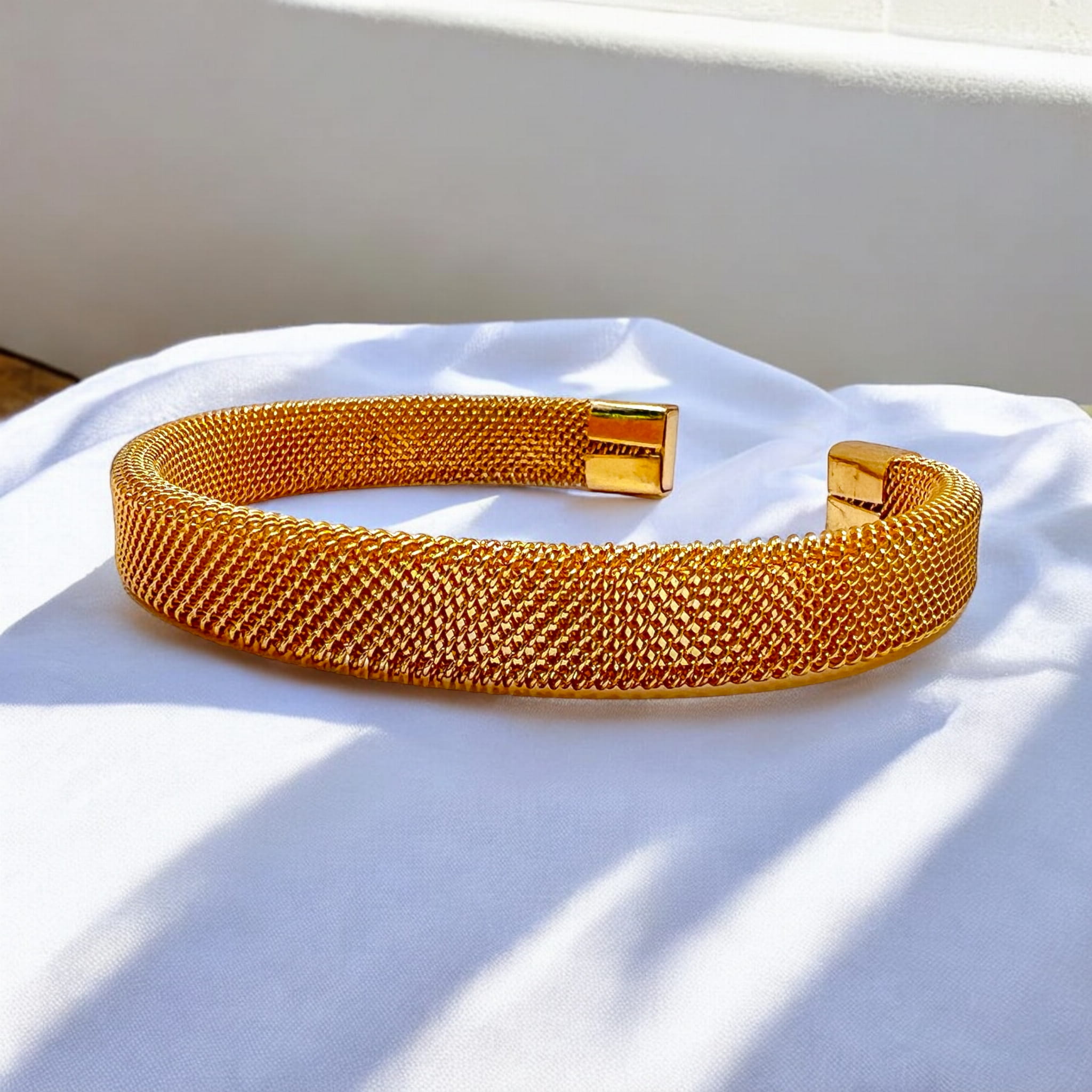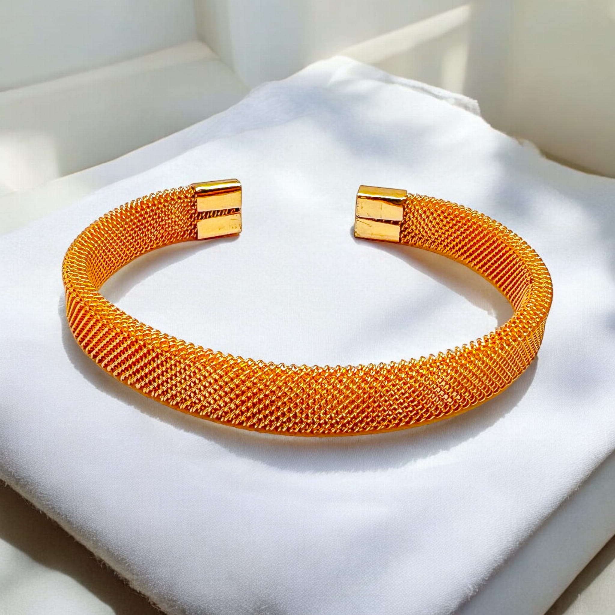Bransoletka z siatki w kolorze srebrnym lub złotym.