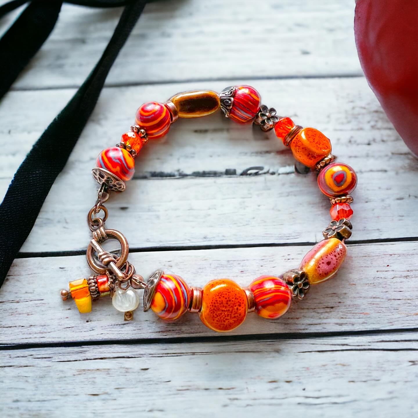 Bransoletka soczysta pomarańcza to piękny, niezwykle kobiecy model, w soczystych, pomarańczowo-czerwonych odcieniach, z naturalnych materiałów: miedzi, jaspisu i ceramiki. Jeśli chcesz się wyróżnić, lubisz niebanalne wzory i rękodzieło, to ten model jest dla Ciebie. Podkreślisz nim swój styl.