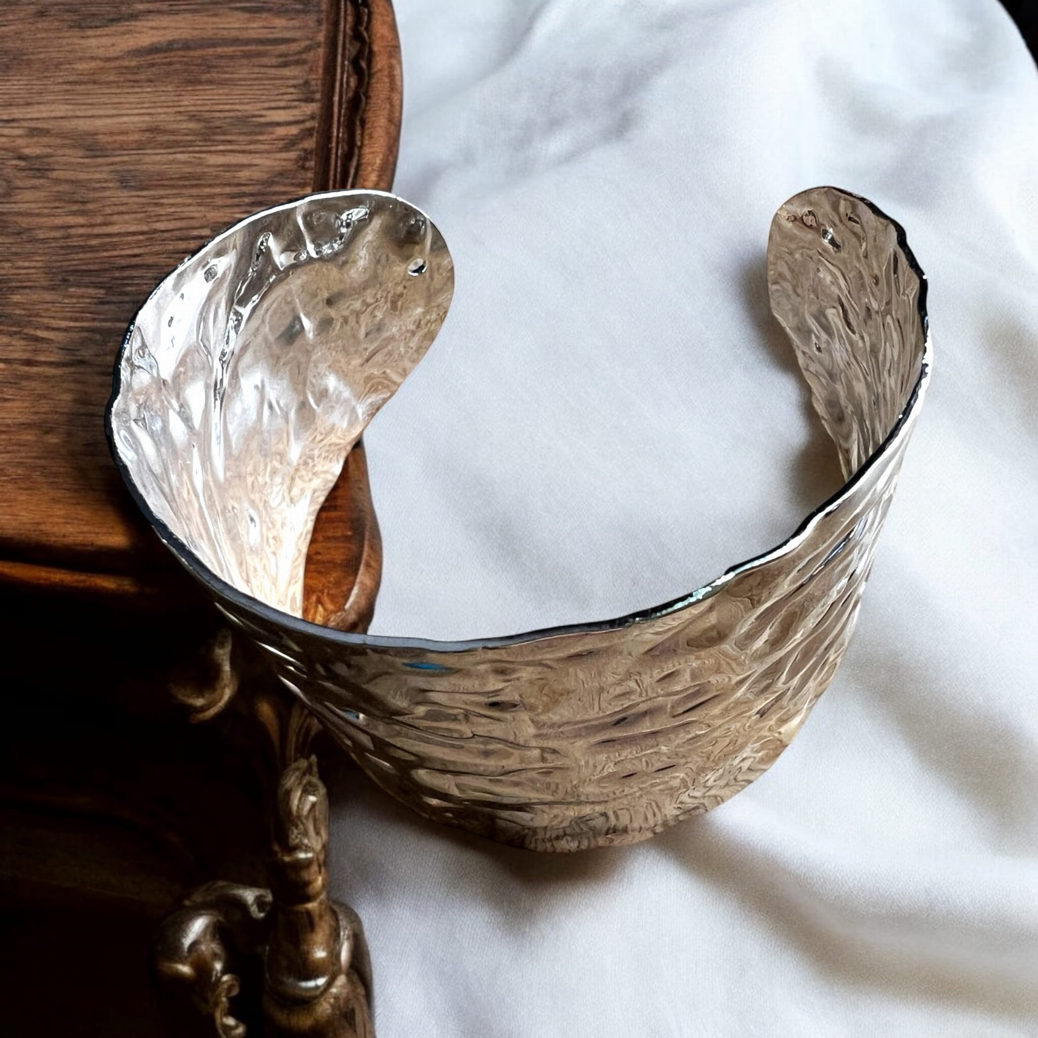 Szeroka bransoletka w kolorze srebrnym, otwarta.