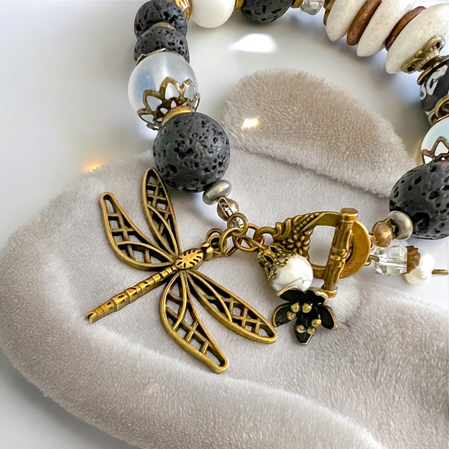 Bransoletka czarno-biała Ważka Nieważka. Dlaczego nieważka? Bo lekka, delikatna i niepowtarzalna. Znajdziesz w niej lawę, biały opal, szkło z recyklingu a to wszystko połączone elementami mosiężnymi. Bransoletka leży wygodnie na nadgarstku, co pozwala cieszyć się jej wyglądem i praktycznością. Bransoletka jest na lekko rozciągliwej gumce, więc dopasowuje się do nadgarstka. Pasuje na obwód ok. 17 cm