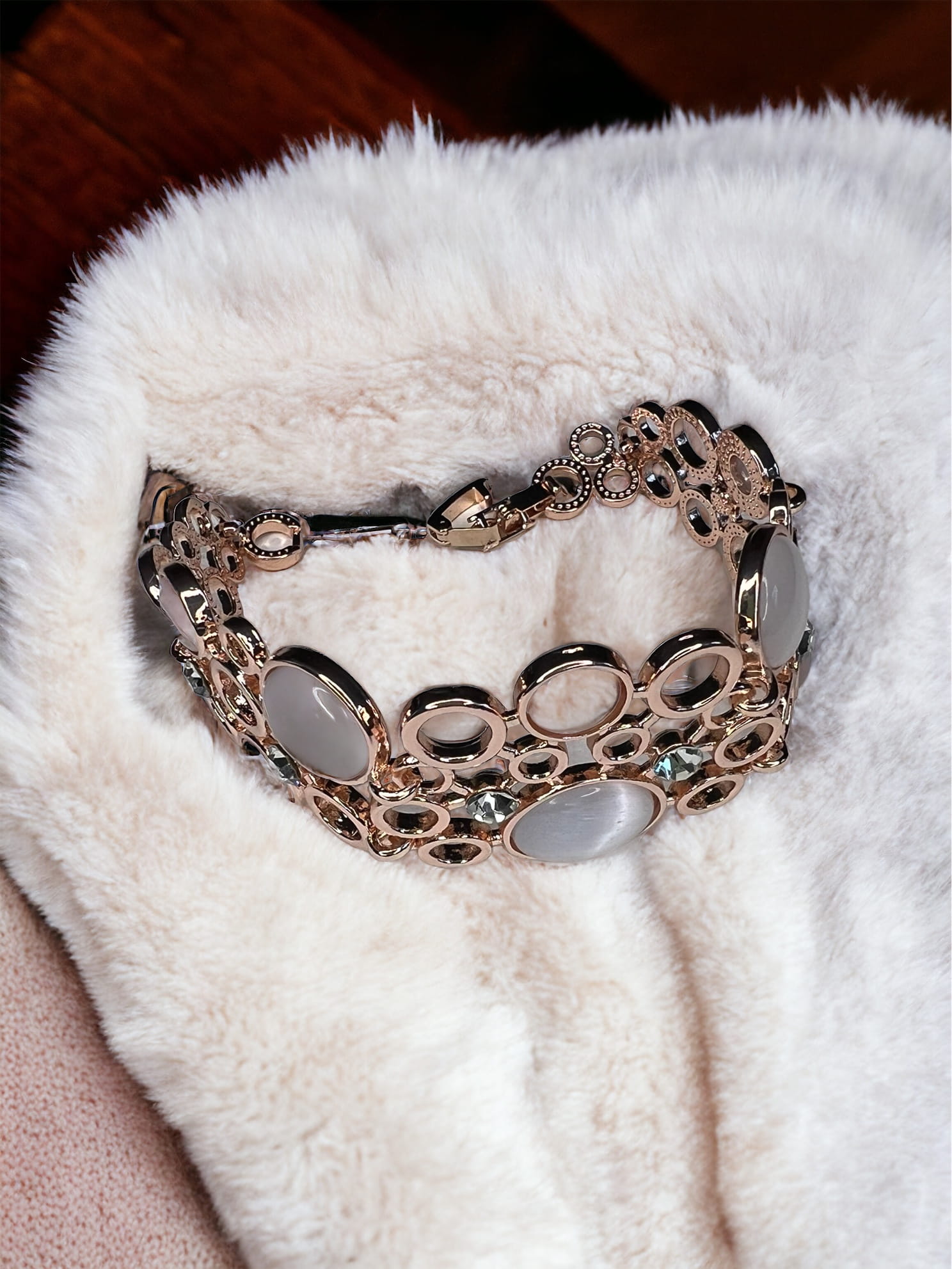 Elegancki design: ta bransoletka ma piękny design z elementami imitującymi opal oraz przeżroczystymi cyrkoniami, oprawione w różowe złoto. Delikatny i kobiecy fason sprawia, że idealnie sprawdzi się na każdą okazję.