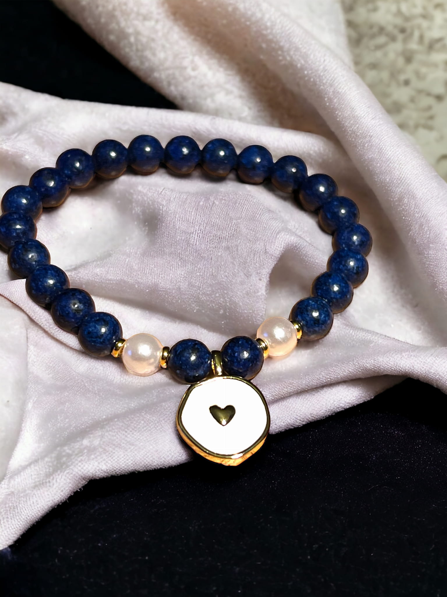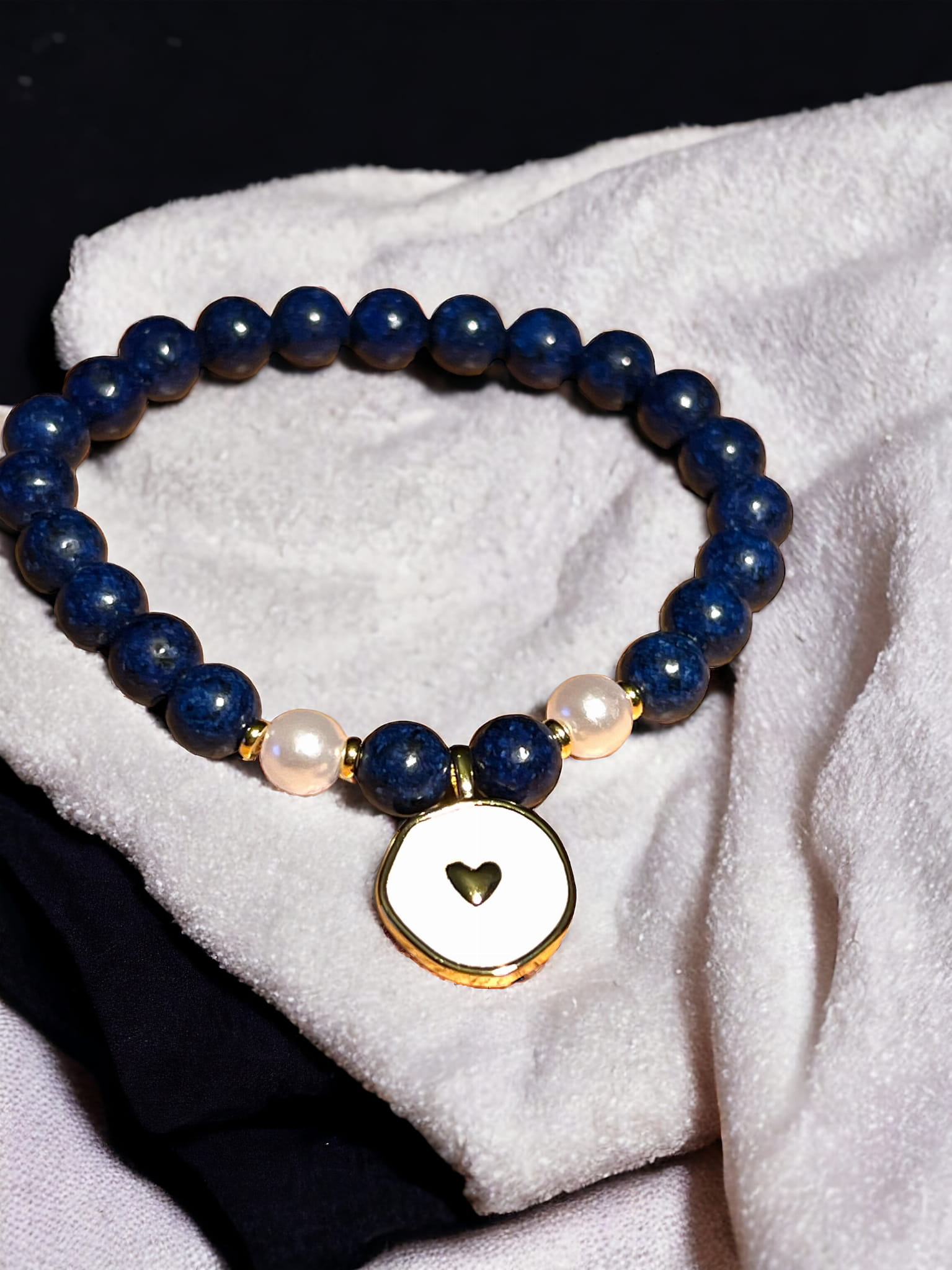 Bransoletka wykonana jest z kamieni naturalnych o średnicy 6 mm. Lazuryt (lapis lazuli) został połączony na gumce, aby dopasował się do każdego nadgarstka. Białe imitacje pereł podkreślają kolor lazurytu, a zawieszka z sercem w kolorze złotym dodaje uroku i lekkości. Bransoletkę możesz nosić samą lub w kompletach. Styl kompletowania różnych wielkości kamieni wprowadza swobodę stroju i podkreśli Twoją osobowość. Granatowy kolor bransoletki sprawdzi się jako uzupełnienie stylu marynarskiego - biało-granatowych stylizacji. Każda bransoletka została wykonana w firmie Perły w Sieci, ręcznie, z najwyższą dbałością o szczegóły. W naszych wyrobach bez obaw możesz brać prysznic czy wykonywać drobne prace domowe. Podkreśl swój styl i postaw na jakość.
