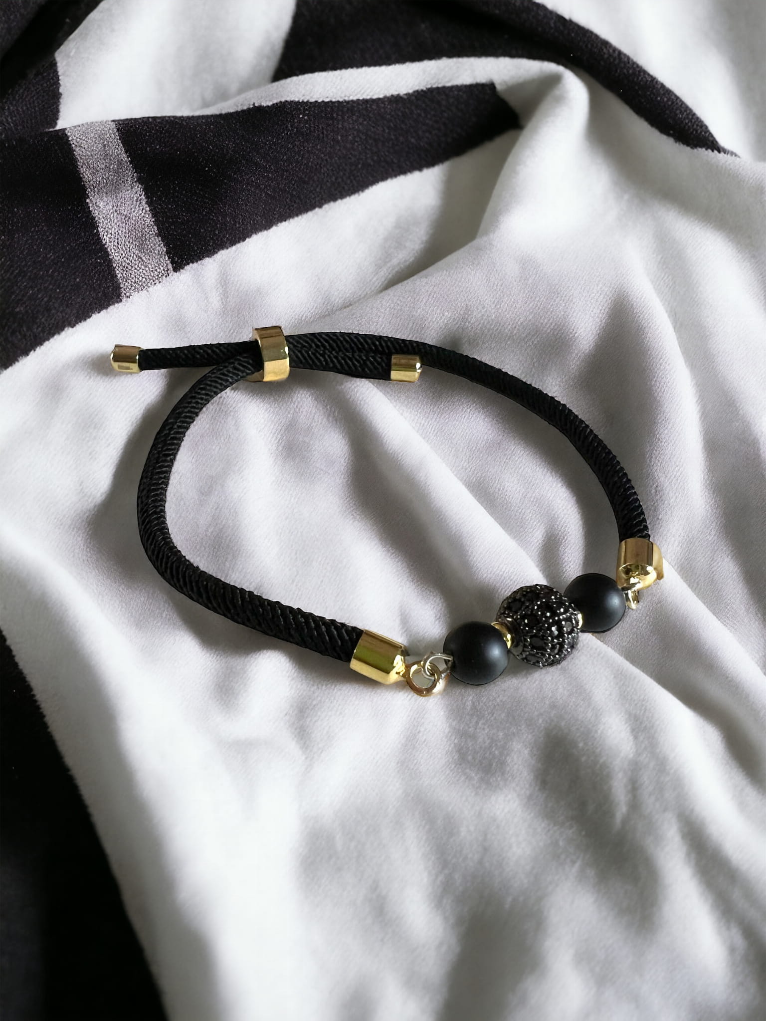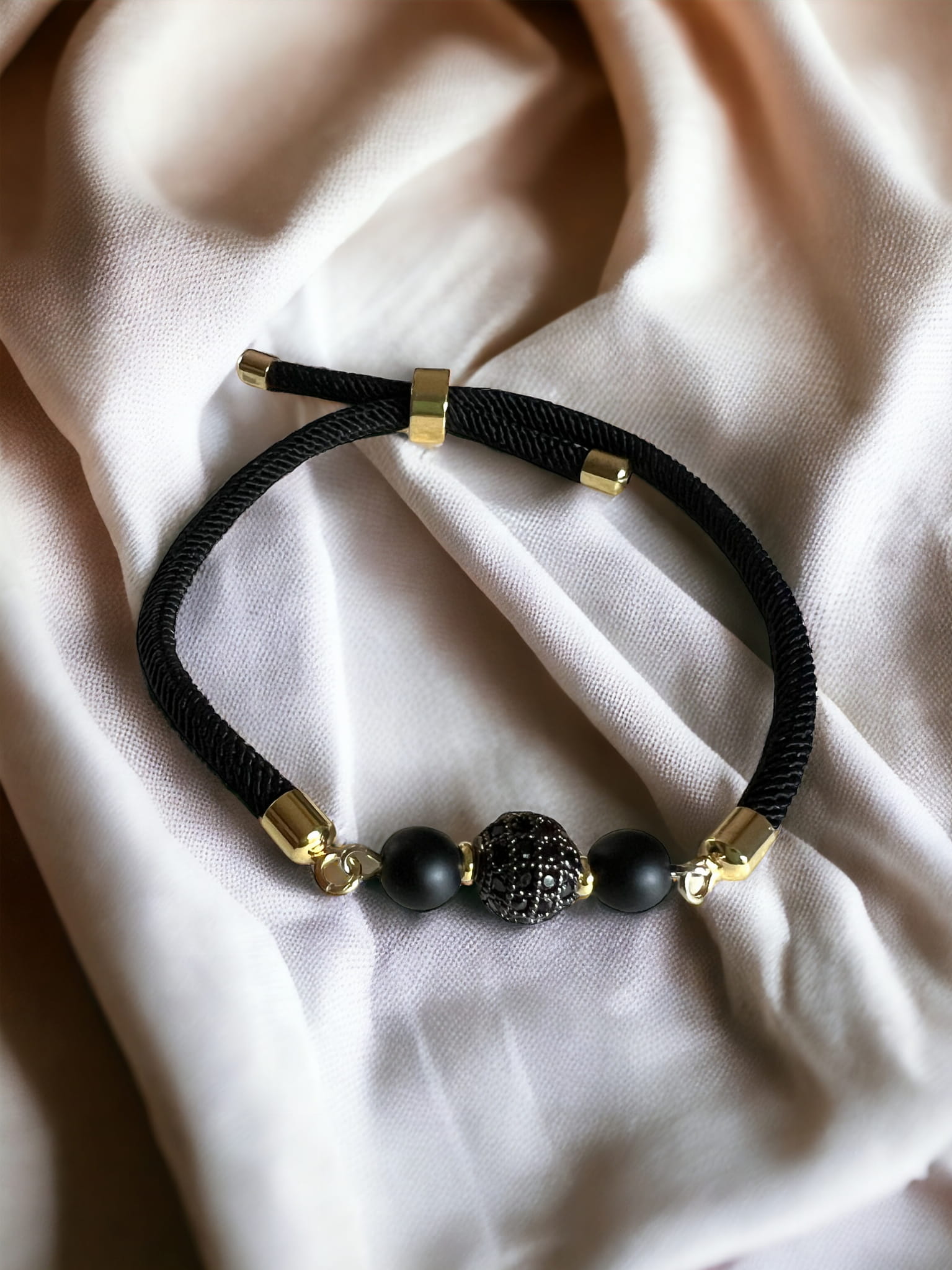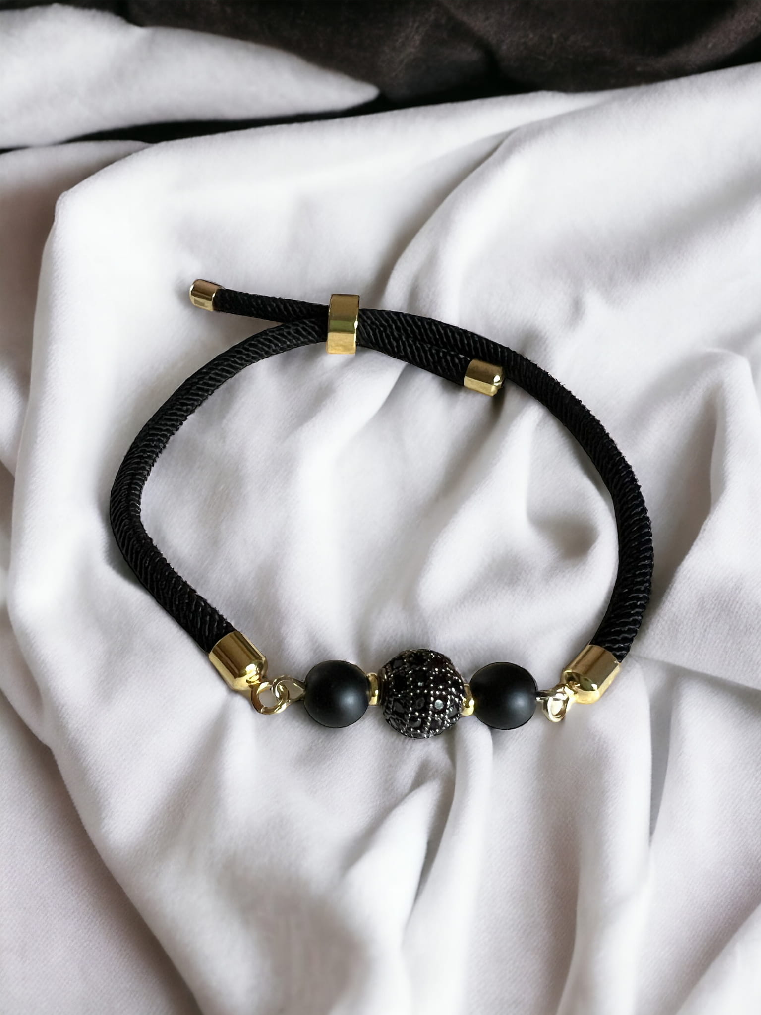 Czarna bransoletka ze sznurka, regulowana do maksymalnej wielkości 19 cm. Sznurek wykończony złoconymi elementami ze stali nierdzewnej. Głównym elementem bransoletki są czarne koraliki z onyksu oraz koralik ozdobiony czarnymi cyrkoniami. Koraliki połączone są złoconymi elementami ze stali nierdzewnej. Bransoletka jest delikatna i urocza, pięknie wygląda na nadgarstku. W kolekcji znajdziesz również inne kolory i modele.