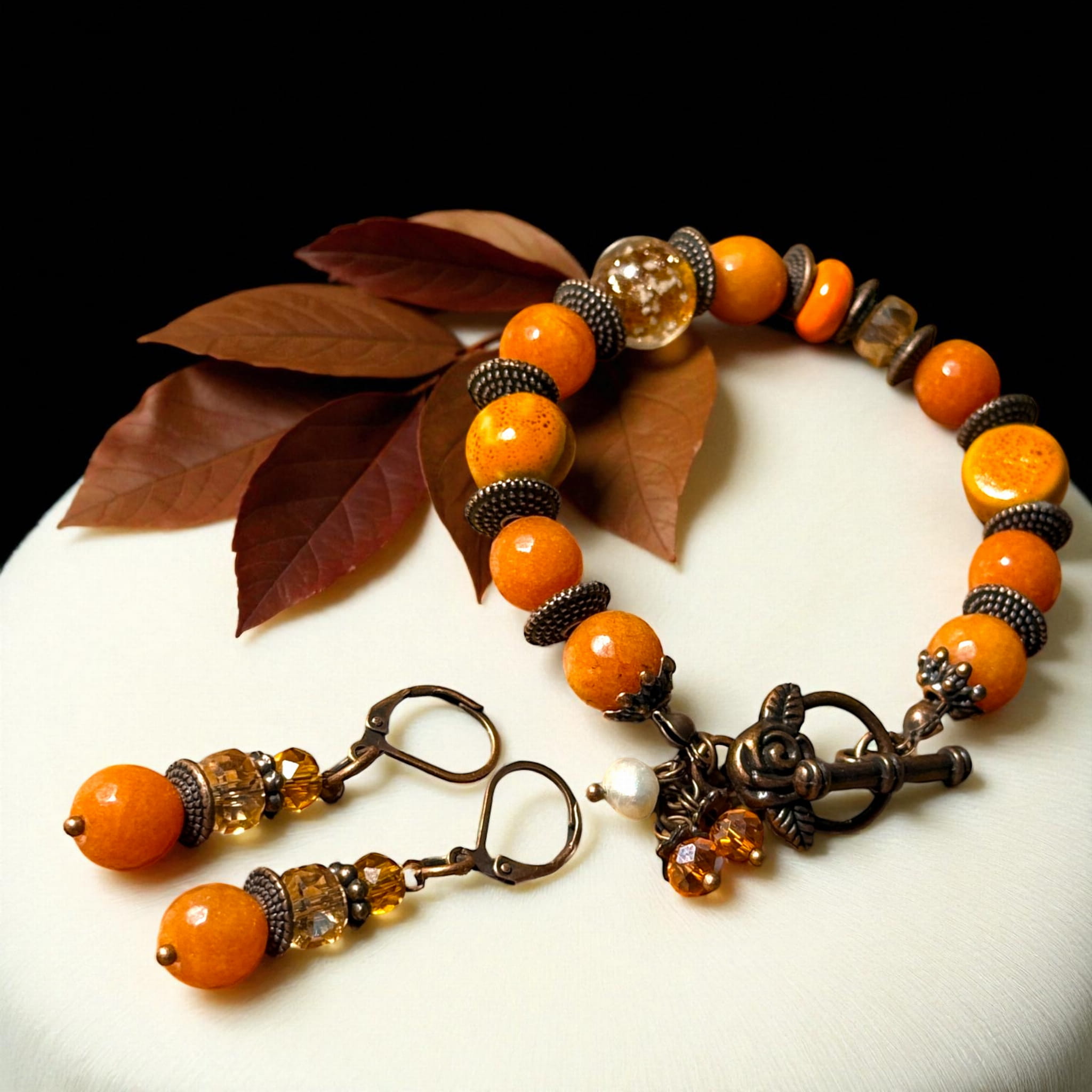 Bransoletka w odcieniach zgaszonej pomarańczy z naturalnego kamienia łączonego z ceramiką. Dodane elementy miedziane. Do kompletu znajdziesz również kolczyki. Jest to biżuteria autorska, wykonana ręcznie. Możliwe drobne różnice wynikające z naturalnych materiałów.