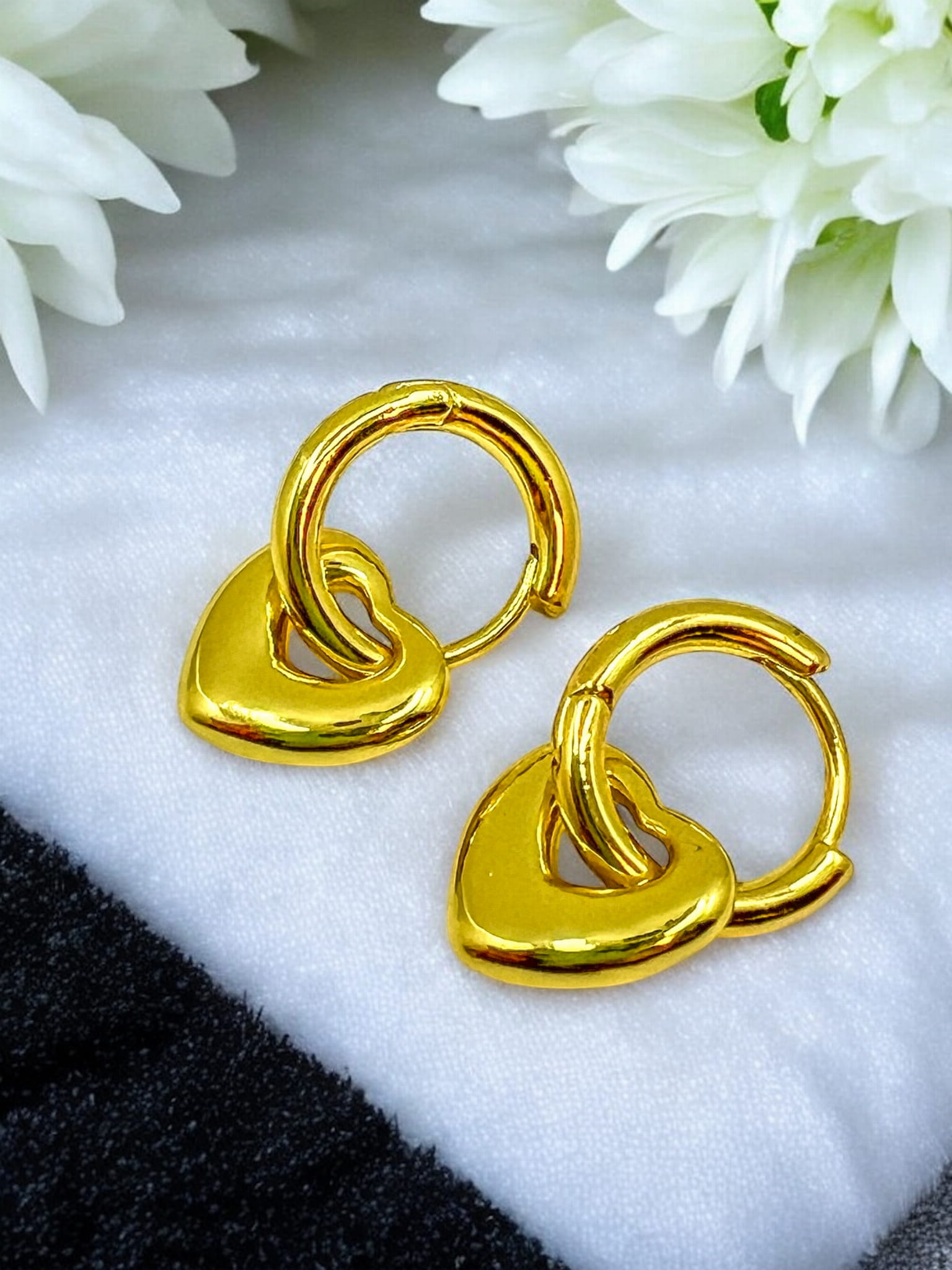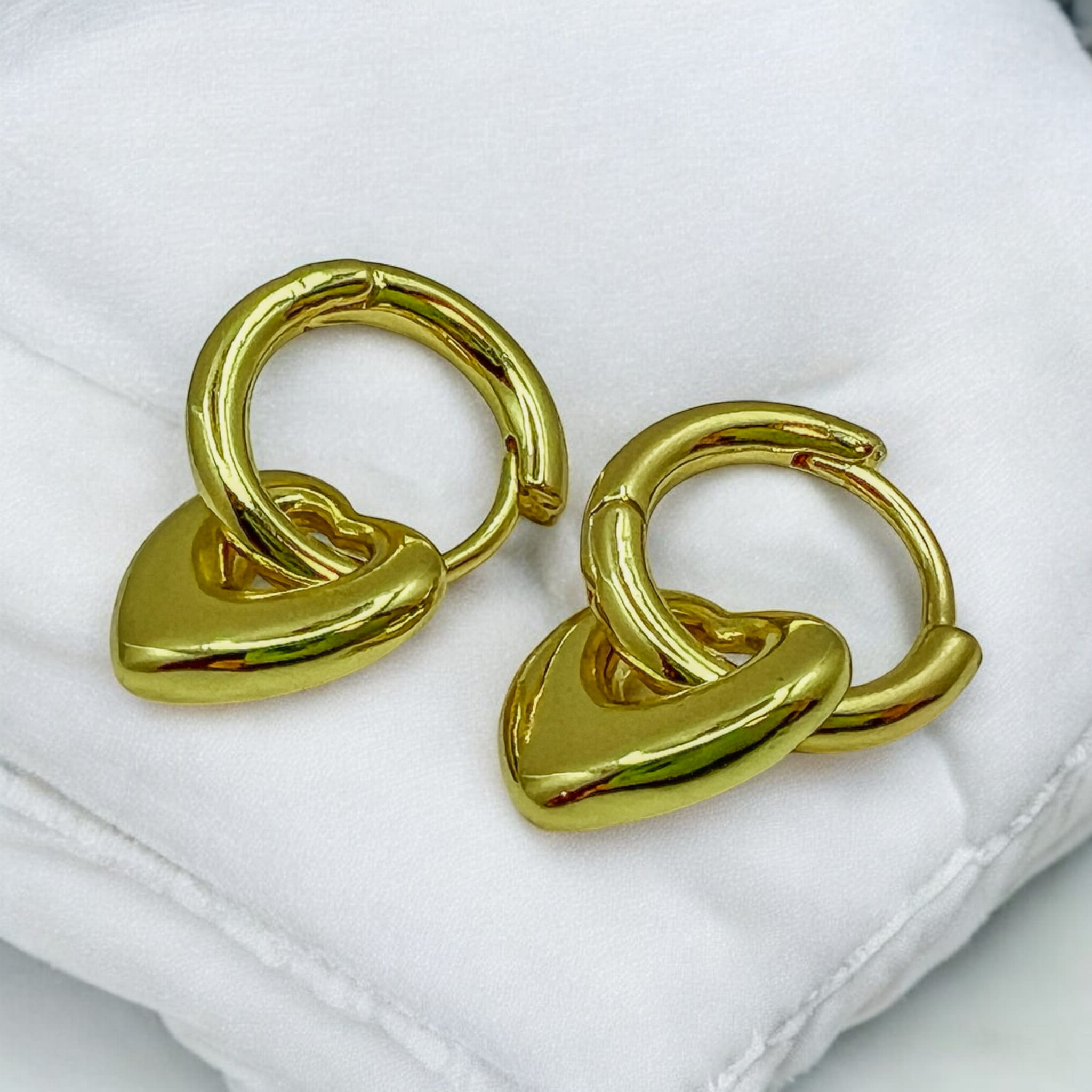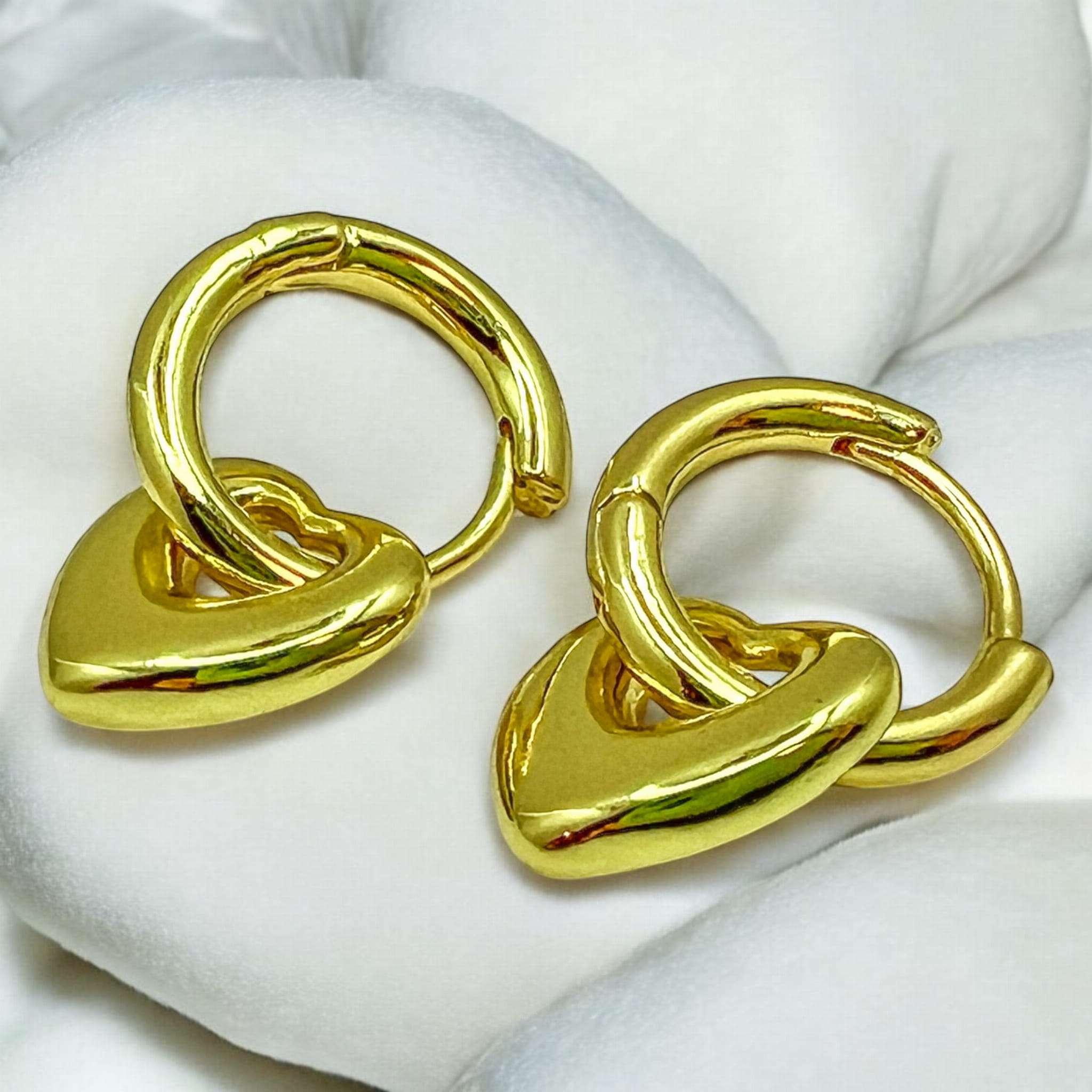 Pięknie lśniące kółeczka pozłacane 18k złotem z zawieszonymi serduszkami, dodajacymi temu modelowi frywolności. Serduszka możesz zdjąć i cieszyć się klasycznym modelem ponadczasowych kółek.