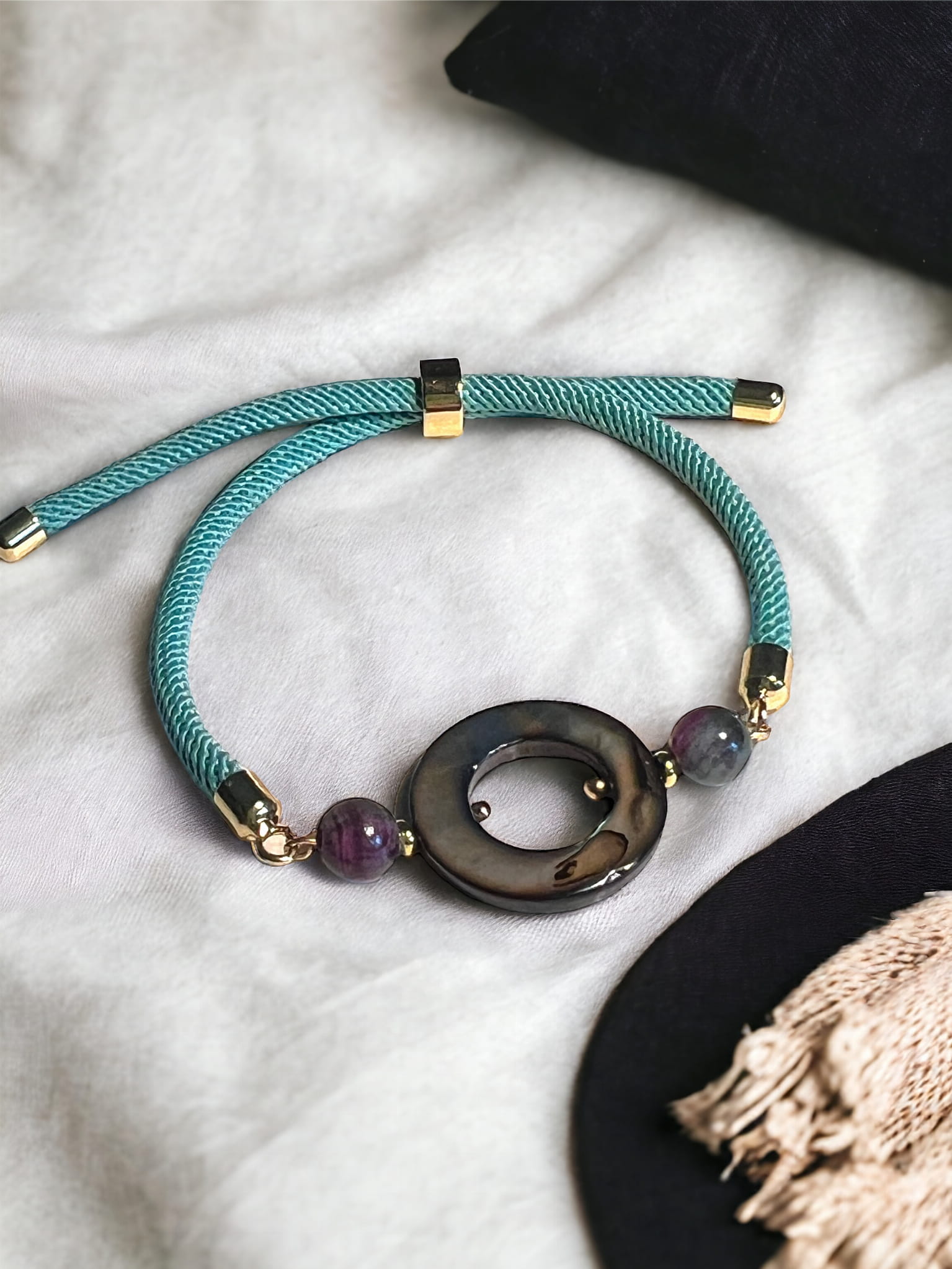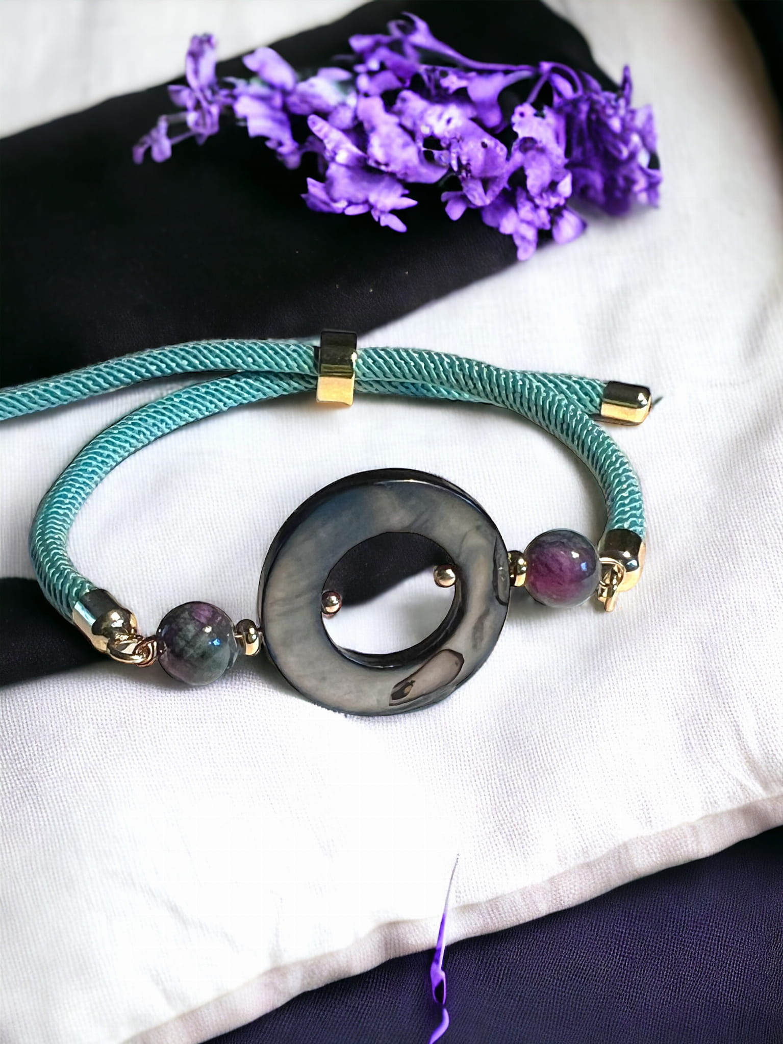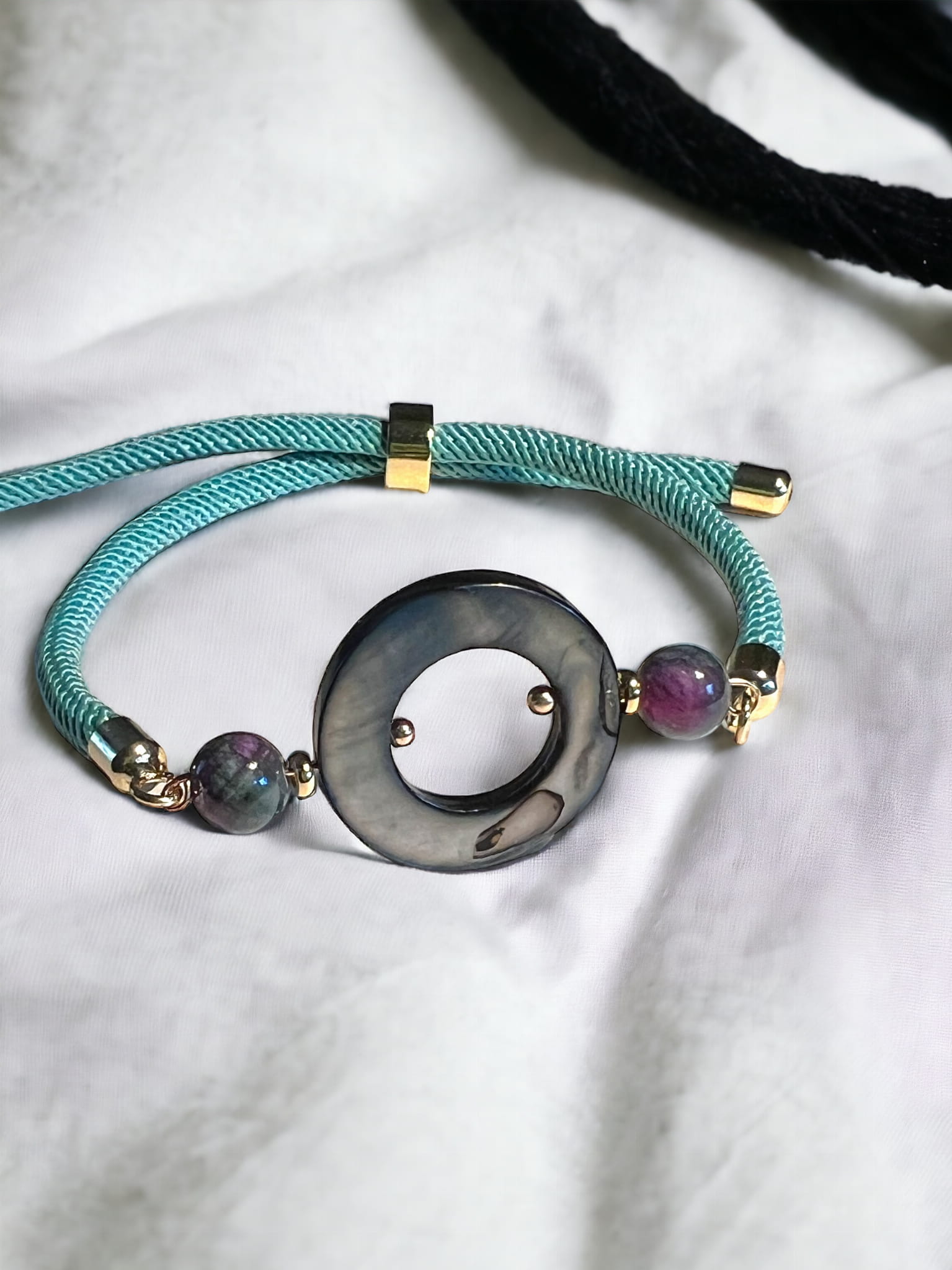 Bransoletka ze sznurka w kolorze zielonym z ozdobnym kółkiem z masy perłowej. Kółeczko jest połączone z dwoma koralikami z zielonego, naturalnego jaspisu cesarskiego z lekkim odcieniem różu. Całość wygląda bardzo elegancko i ciekawie. Zewnętrzna średnica kółka to 2 cm. Element łączące wykonane są z pokrytej 18k złotem stali nierdzewnej. Zapięcie sznurka dobrze trzyma, co zabezpiecza bransoletkę przed zgubieniem bransoletki. Bransoletka w kolorze zieleni będzie pięknie wyglądać do wiosennych, delikatnych strojów. Założysz ja do codziennych i eleganckich kreacji.